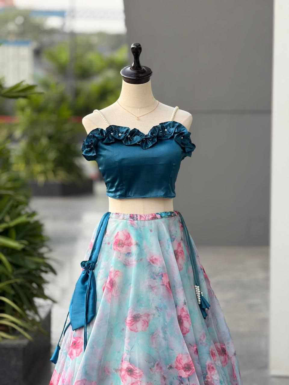 Lehenga – Pure organza silk digital printed lehenga with a grand 8-meter flair, finished with canvas patta for beautiful structure