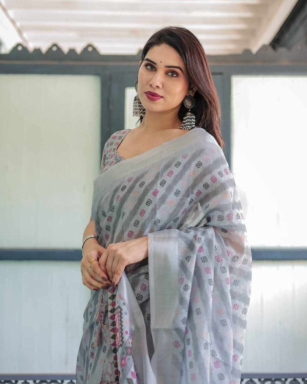 Premium Silver Weaving Linen Cotton Saree