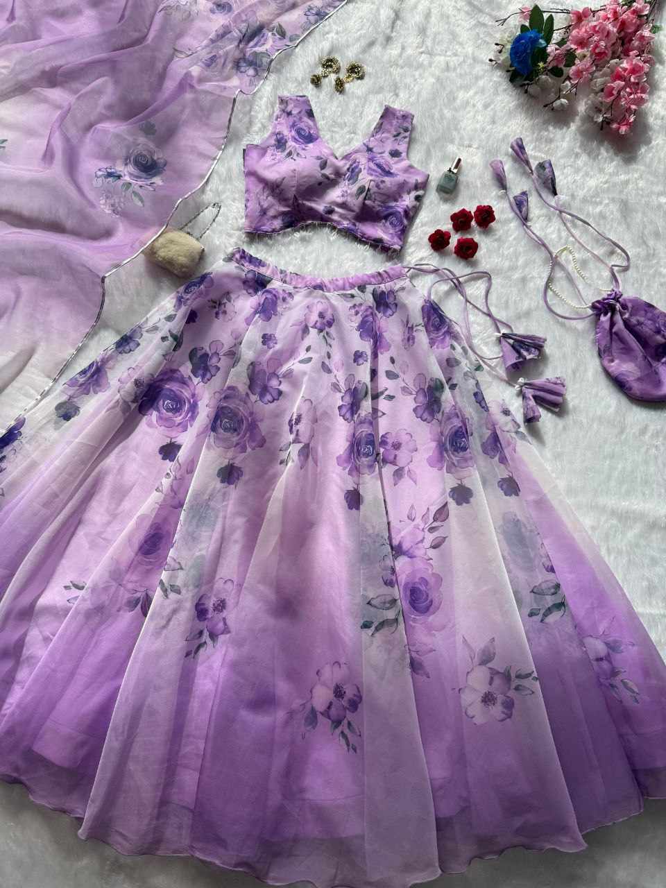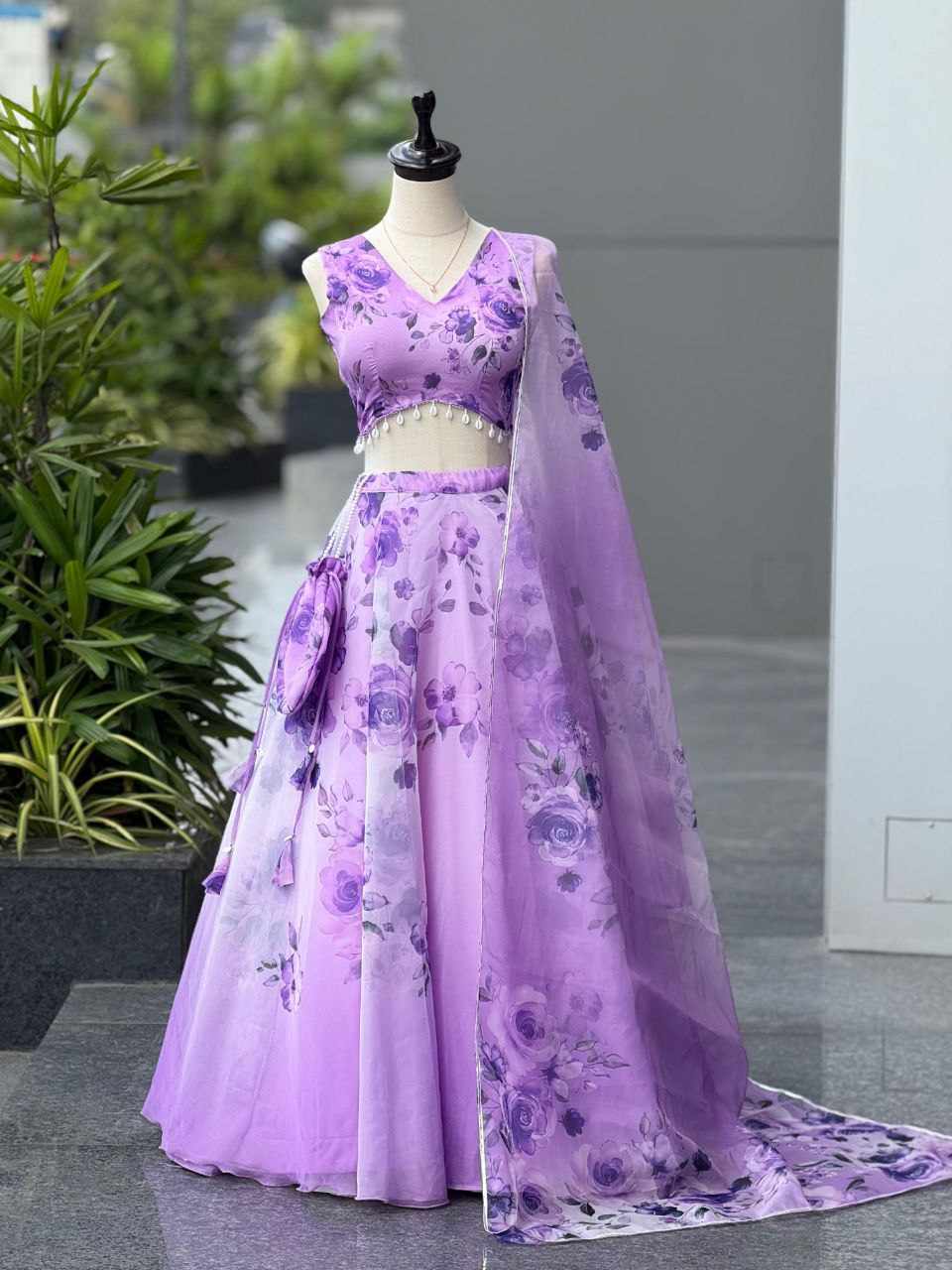 Lehenga – Pure organza silk digital printed lehenga with a grand 8-meter flair. Finished with canvas patta for a perfect flare